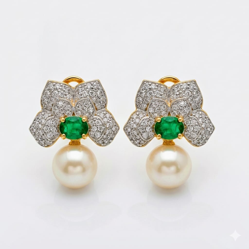 Pearl With Green Emerald Stone Earrings